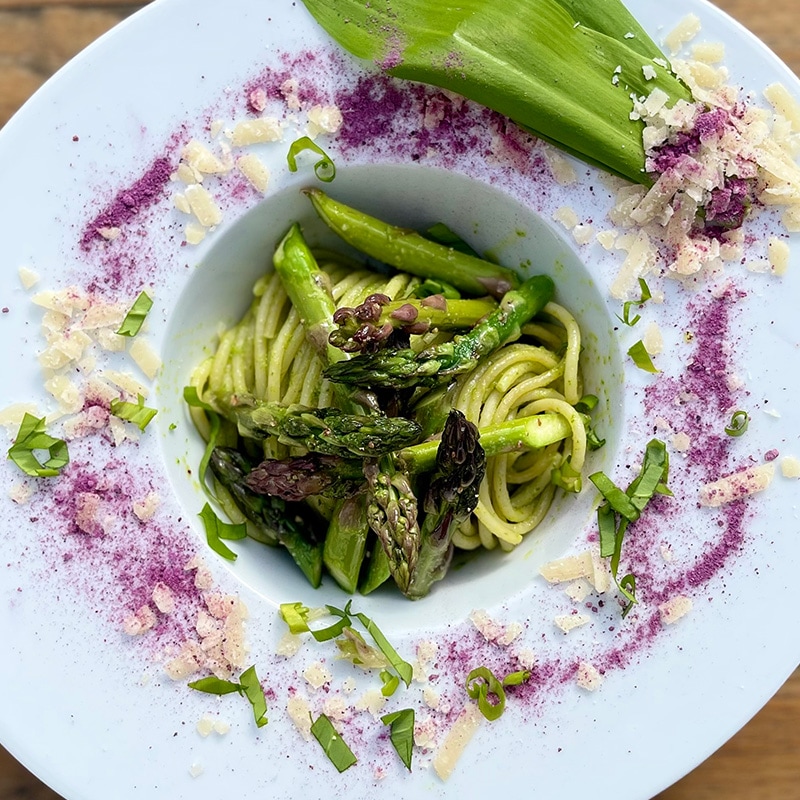 Bärlauch-Nudeln mit gebratenem grünem Spargel, fermentiertem Rotkohlpulver und gehobeltem Parmesan