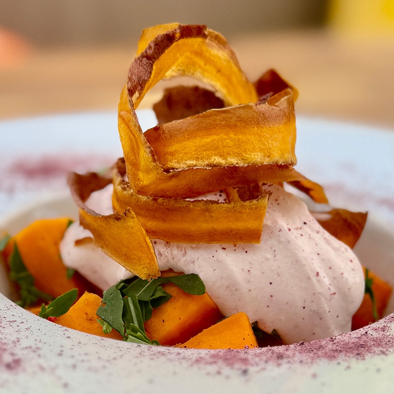 Süßkartoffelragout mit fermentiertem Rotkohlpulver, Schmand und gebackener Süßkartoffelschale